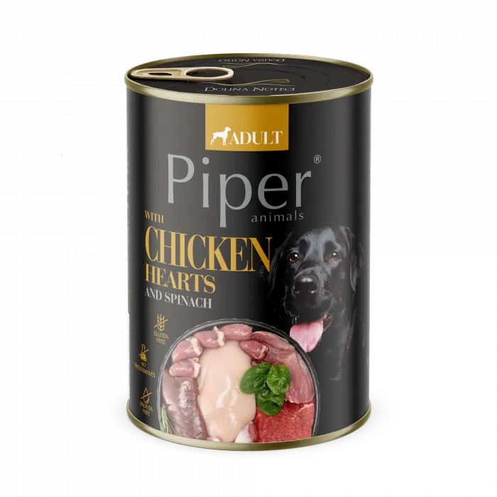 PIPER este o hrană umedă premium, special formulată pentru a oferi câinilor adulți o alimentație echilibrată și ușor digerabilă. Inimile de pui sunt o sursă excelentă de leucină, fenilalanină, fier, cupru și zinc, esențiale pentru sănătatea musculară și metabolism.