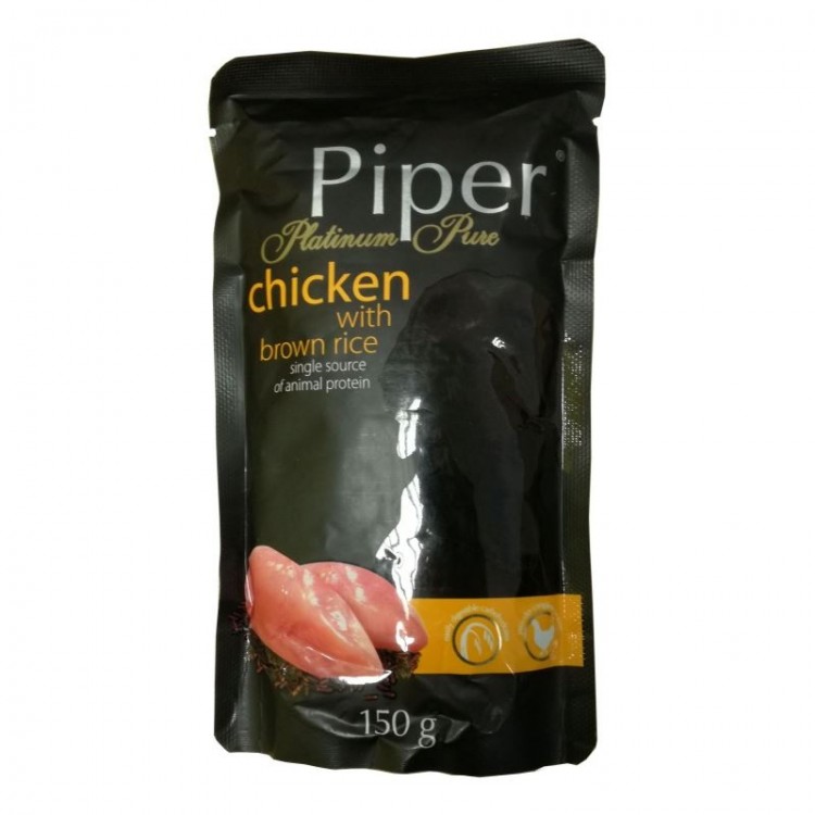 Piper Pure, carne de pui si orez brun, plic, 150 g este o hrana monoproteica completa si echilibrata pentru caini de toate rasele. Indicata cainilor alergici la anumite surse de proteine.