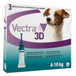 VECTRA 3D 4-10 KG – este o solutie antiparazitara externa pentru caini cu actiune pentru: pureci, capuse, flebotomi, tantari si musca de grajd.